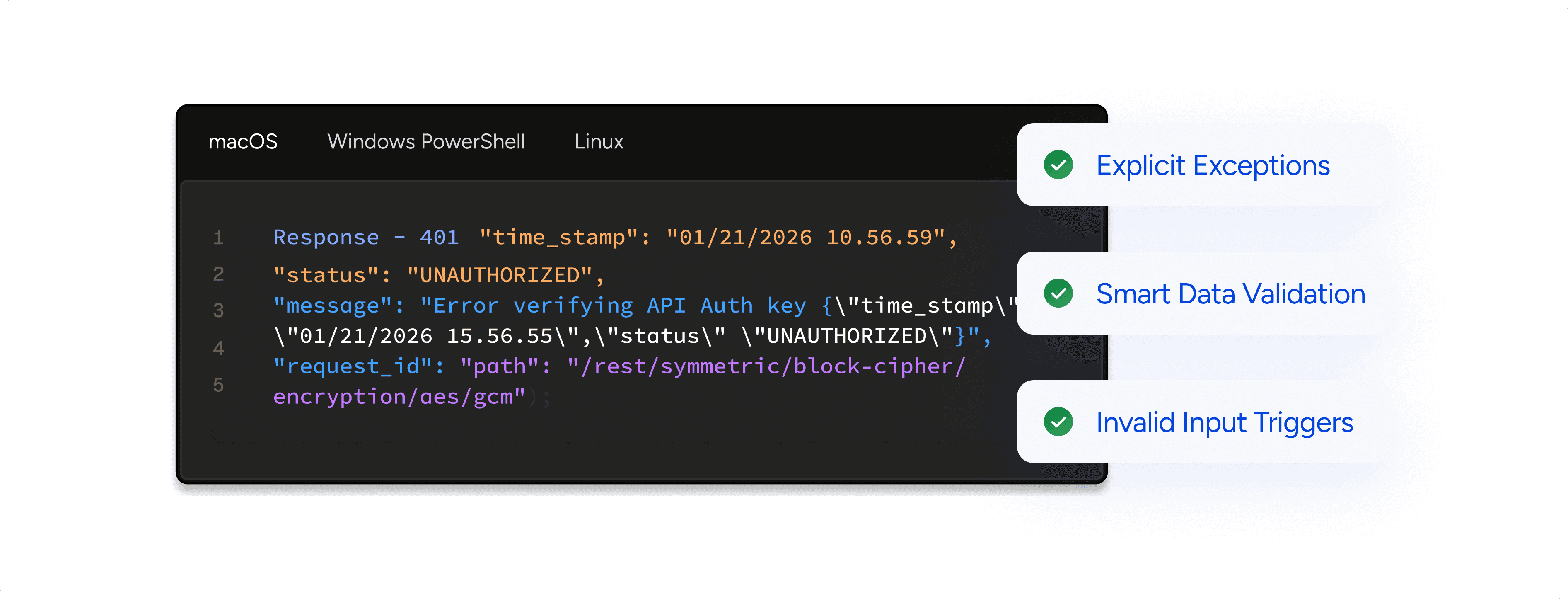 CipherTEA provides explicit exceptions and smart data validation so developers instantly know what’s missing, incorrect, or required. Every invalid input triggers a precise, human‑readable message that eliminates guesswork.